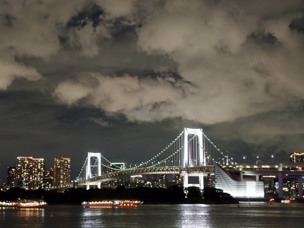 東京最著名的大橋,莫過於橫跨舊城區芝浦與臨海副都心台場的彩虹大橋了。彩虹大橋於1993年通車,促進當年正在開發的台場加速發展。結構方面,大橋採用雙層結構,上層作為首都高速公路,下層作為連接芝浦與台場的「百合海鷗號」軌道。交通方面,則分散了從千葉縣及神奈川縣往東京都心的車流人流,降低塞車的可能性。當然,最重要的還是作為東京灣的地標。1997年日劇戀愛世代中,木村拓哉與松隆子在橋上散步的場景,一度讓彩虹大橋成了熱門的約會地點,而之後也不斷有日劇或電影來此取景拍攝,成了東京灣屹立不搖的象徵建築之一。