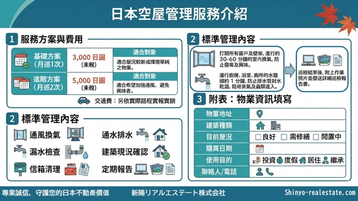 新陽也有提供空屋管理服務。如需洽詢,請填寫下方表單,馬上有專人與您聯繫。