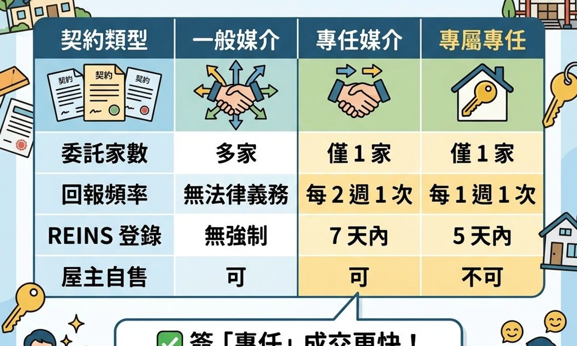 特點: 只能委託一家仲介,不能私下找別家。但如果是您親友想買,還是可以自己成交(不透過仲介)。