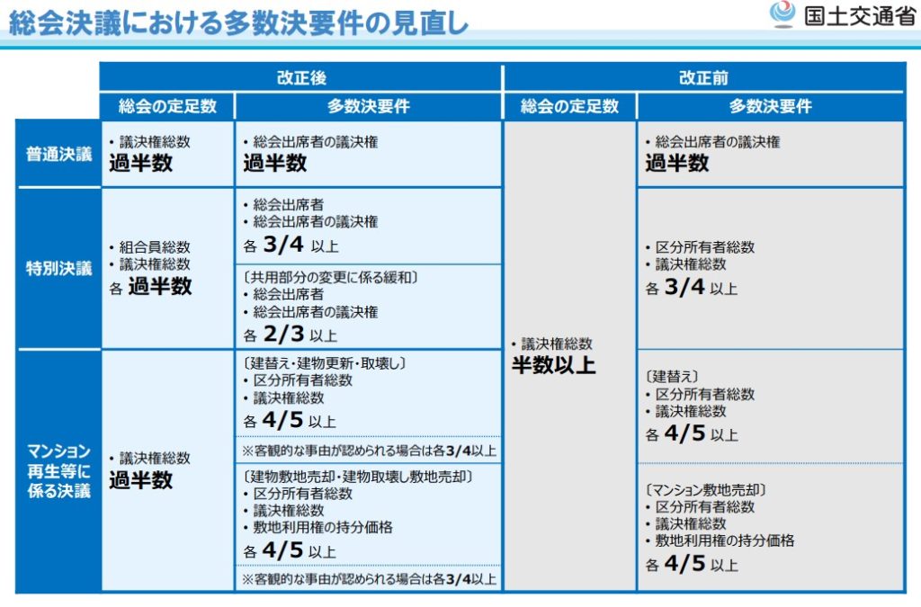 過去「特別決議」(包括修改規約、共用部分的重大變更或建物大規模修復等)需全體所有權人及議決權人數的 3/4 以上同意;未來將改為以 「出席者」的 3/4 以上同意即可通過。甚至部分經客觀事實認定的改建,也改為由原本需全體所有權人及議決權人數 4/5 變為 3/4 。